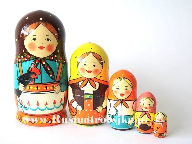 Deze 5-delige set is met de hand beschilderd door een kunstenaar en daarna gelakt. De grootste pop is 18 cm hoog.